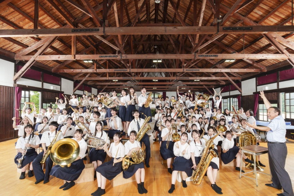 第一弾は、私の青春の舞台でもある明誠学院高等学校吹奏楽部。総勢94名の部員が参加してくれました。撮影当日、対面した後輩たちからの「おはようございます!!」という目の覚めるような挨拶で洗礼を受けます。うん、社会人になったからといって、この「元気」と「ハツラツ」さを忘れてはいけない。そう胸に刻んでいると、そんな生徒たちの活気を一人ではるかに上回る名物顧問「稲生先生(前ページ写真右端の男性)」が登場。撮影現場のボルテージが一気にぶち上がります。一度聞いたら忘れられない、独特なざらつきが心地いい声(桂ざこば師匠のような)は健在。還暦を過ぎているのに、全身から溢れ出るエネルギッシュなオーラで部員たちを鼓舞します。強豪校としての実力、部活動が養う礼儀礼節、全てはこの先生の熱き指導に支えられているんだ。今回の取材撮影で見た部員たちの姿が、それを証明していました。気持ちのいい挨拶や他者への気遣い、真剣な眼差しと全力で応えようとする姿勢。私も含めて、多くの大人が失ってしまいがちなものが、明誠学院高等学校吹奏楽部にはありました。それはたった一人の圧倒的な情熱が伝播することで生まれる、音楽を超えて「人を育てる力」でもあります。私も編集部にとっての稲生先生のような存在になれるよう、がんばります!