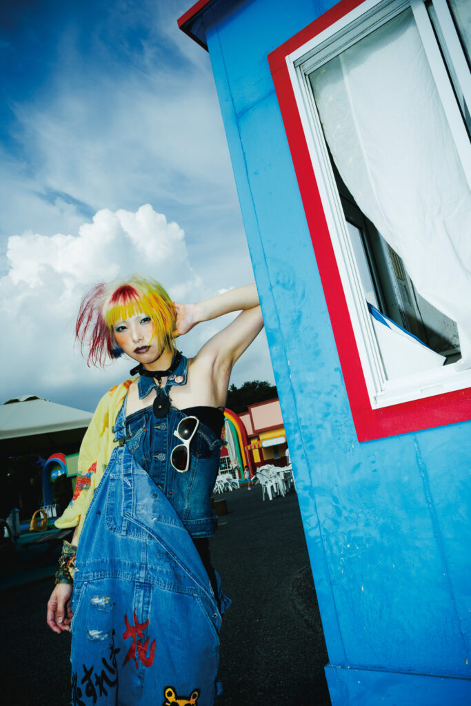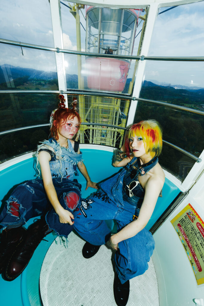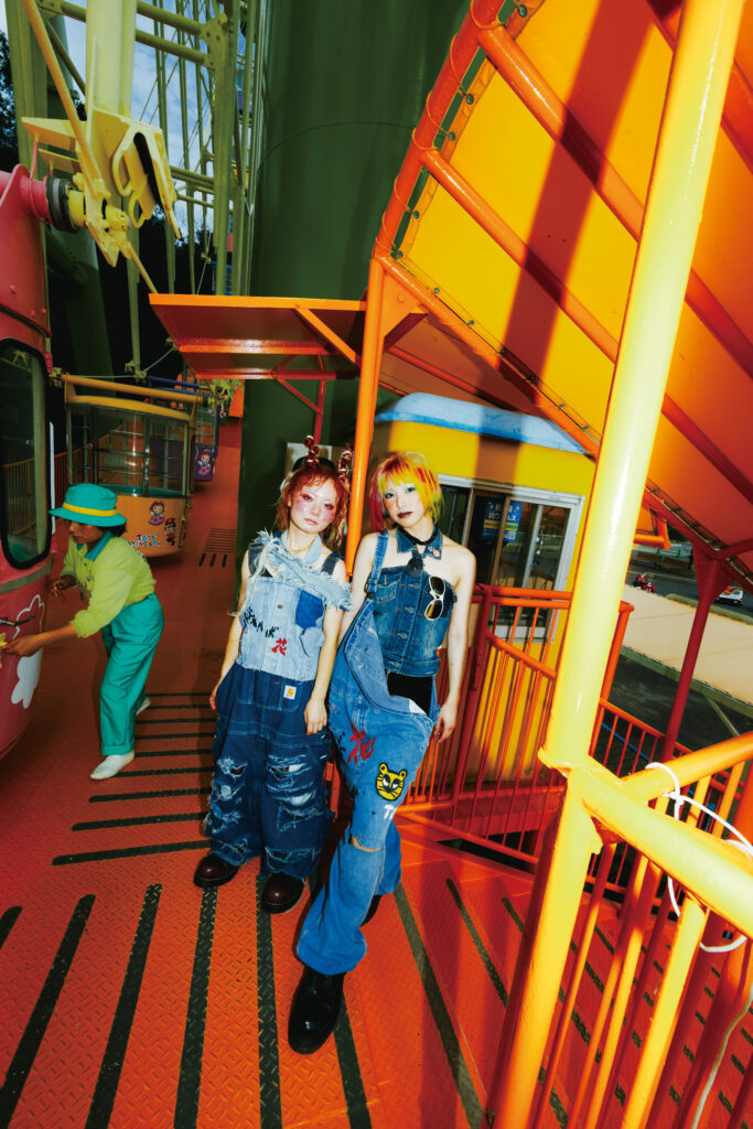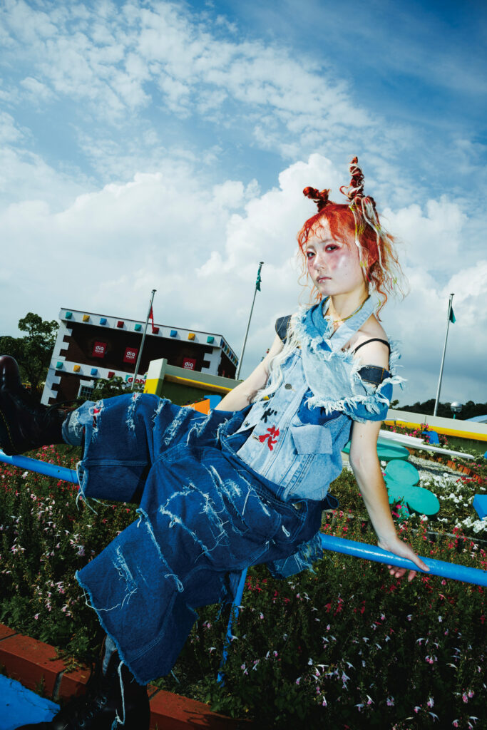特集シューティングでYuki氏(baho IZM)が掲げたコンセプトの核は、「カウンターカルチャーと〈光〉」。シューティングの舞台として、まずはは玉野市にある「おもちゃ王国」へ。懐かしさを帯びつつ自由で前衛的なイメージを追求したヘアメイクに、デニムやオーバーオールをリメイクしルーズに着崩すことで、日常に異質な気配を差し込んだ。モデルはクラッシュペインティングを施したデニムをまとい、クールさと可愛らしさを同時に際立たせる。街の光や日常の風景に装いが溶け込む瞬間、カウンターカルチャーの精神が自然に立ち上がった。