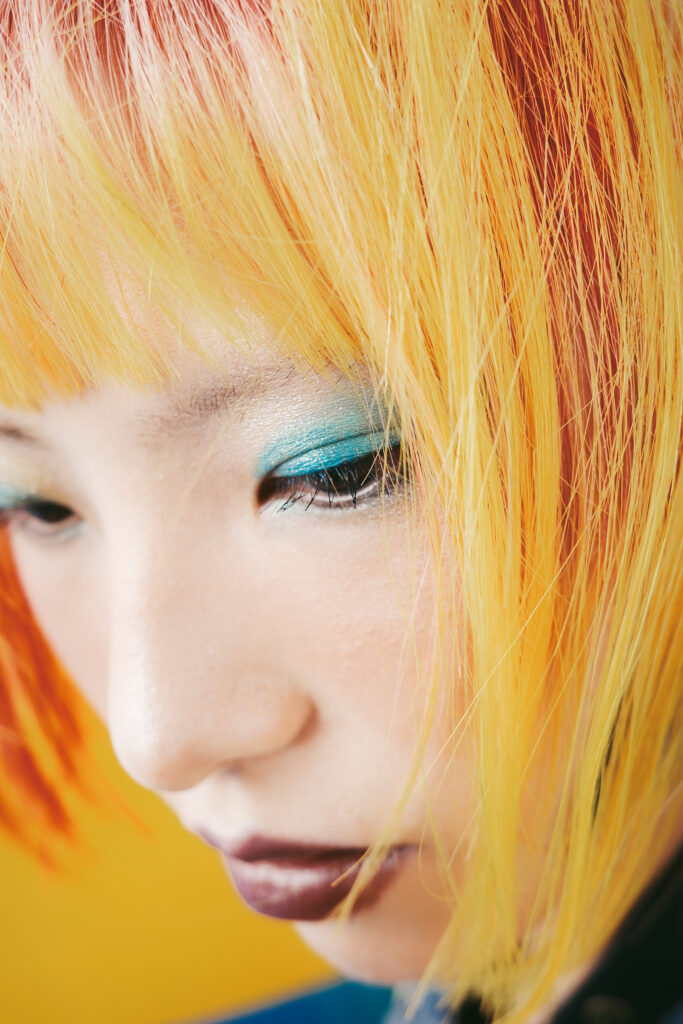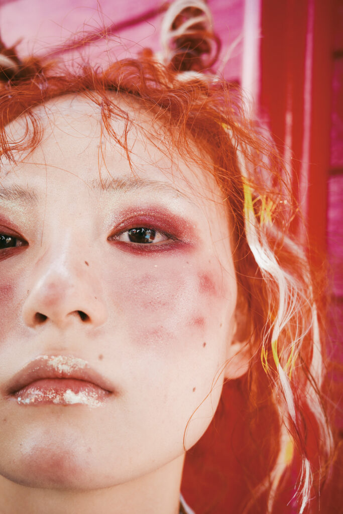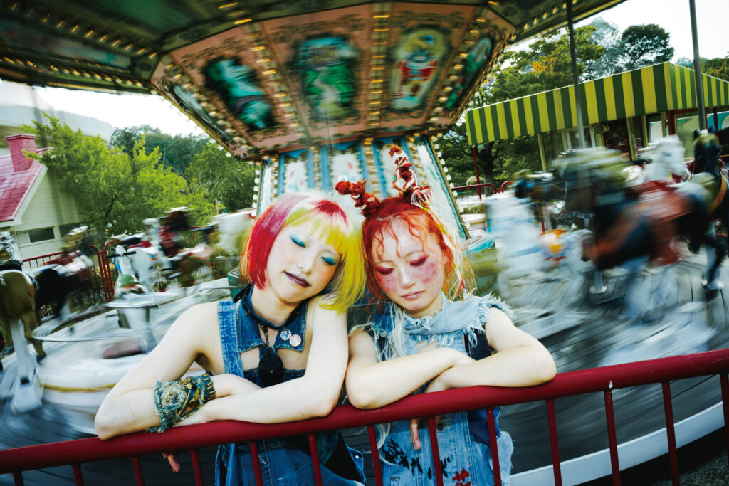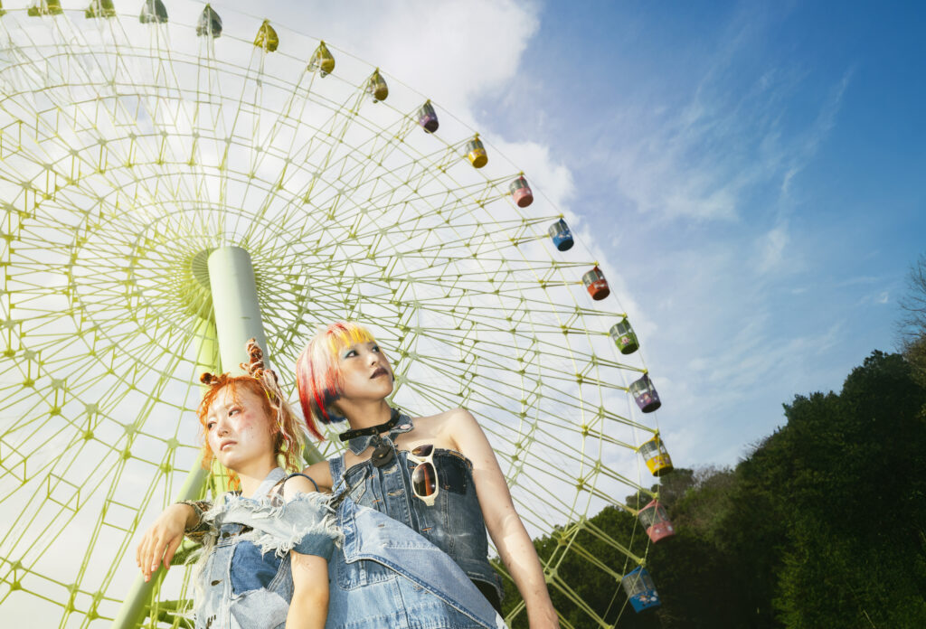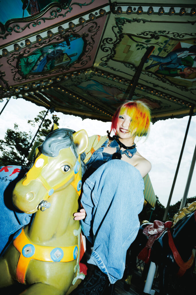 特集シューティングでYuki氏(baho IZM)が掲げたコンセプトの核は、「カウンターカルチャーと〈光〉」。シューティングの舞台として、まずはは玉野市にある「おもちゃ王国」へ。懐かしさを帯びつつ自由で前衛的なイメージを追求したヘアメイクに、デニムやオーバーオールをリメイクしルーズに着崩すことで、日常に異質な気配を差し込んだ。モデルはクラッシュペインティングを施したデニムをまとい、クールさと可愛らしさを同時に際立たせる。街の光や日常の風景に装いが溶け込む瞬間、カウンターカルチャーの精神が自然に立ち上がった。