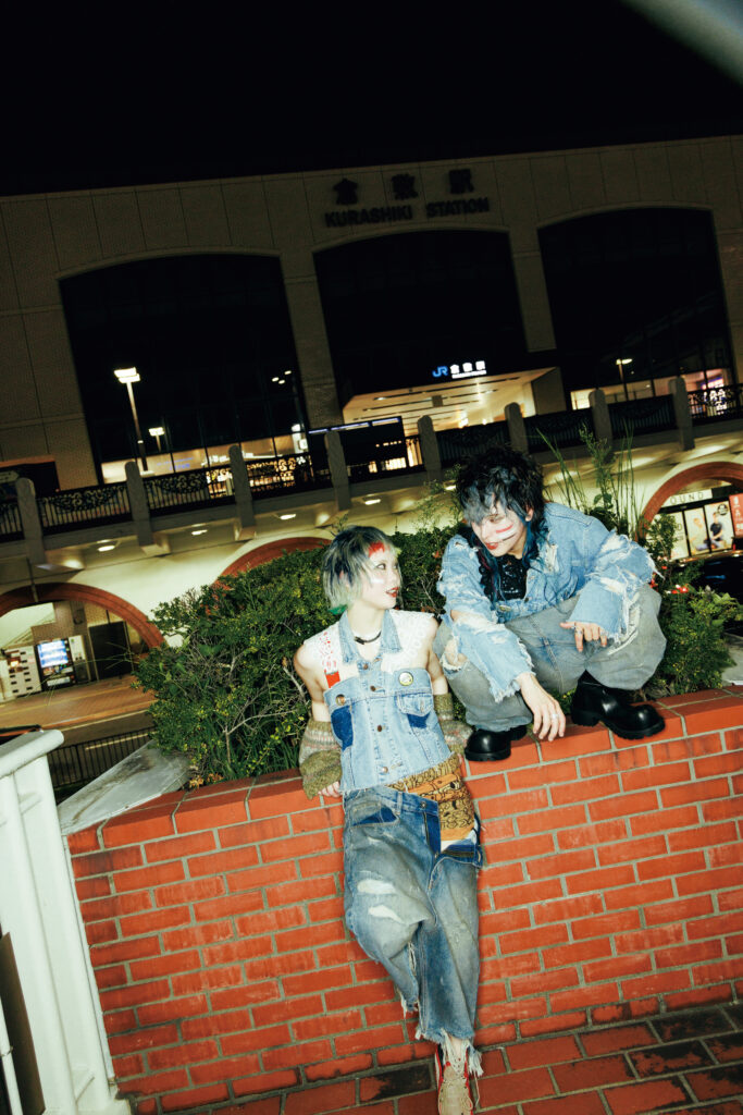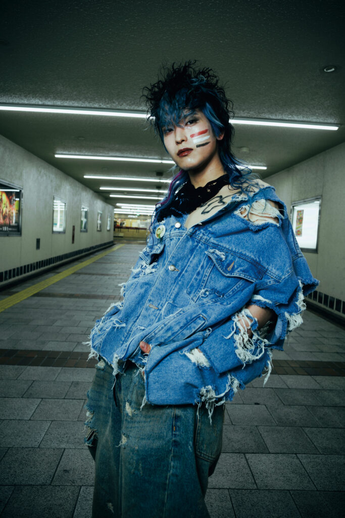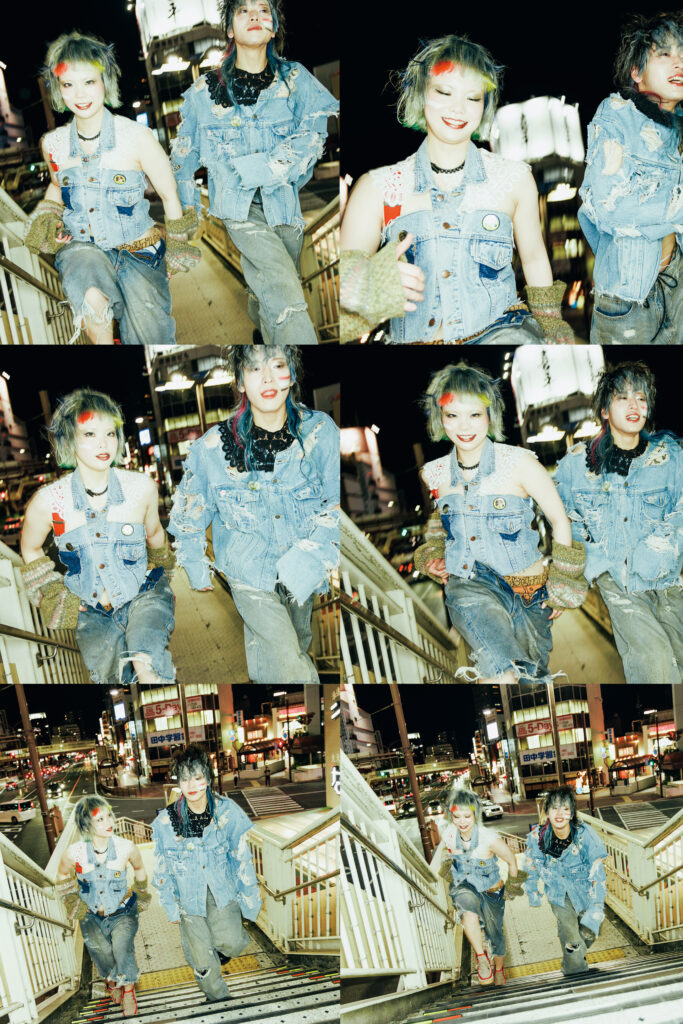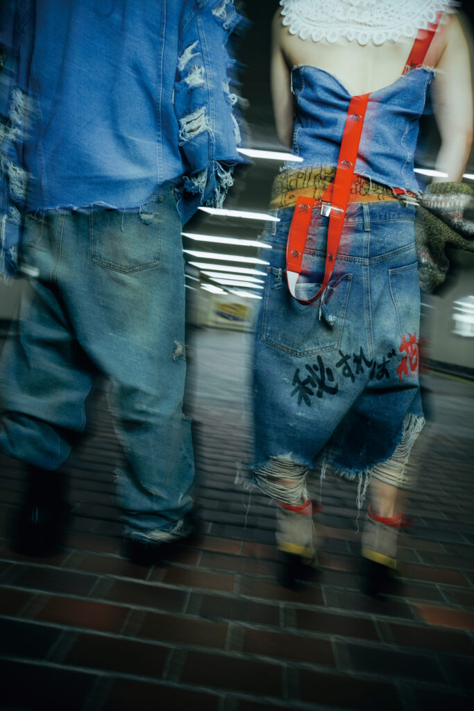 特集シューティングでYuki氏(baho IZM)が掲げたコンセプトの核は、「カウンターカルチャーと〈光〉」。いまの日常や既成概念を過去に置き、未来へ目を向ける。個の〈自由〉を促し、自分を自由に表現することの楽しさを体感させるように作品が構築された。流行に追随するのではなく、60年代の反骨的ムードを意識し、デニムのブルーを基調に衣装は自ら加工・リメイク。退廃的で反社会的な気配を纏わせ、アンチSNSとしてお尻には「秘すれば花」の文字が。ロケーションは、Yuki氏自身も身を置く倉敷の街。夜の街の光が、〈グランジ〉の世界観を街に浮かび上がらせた。