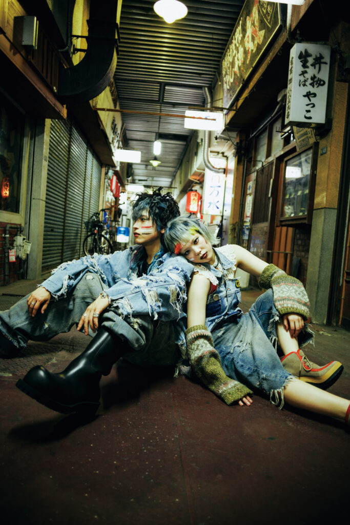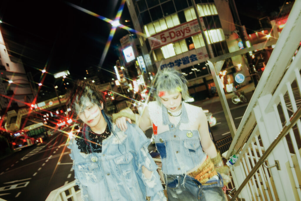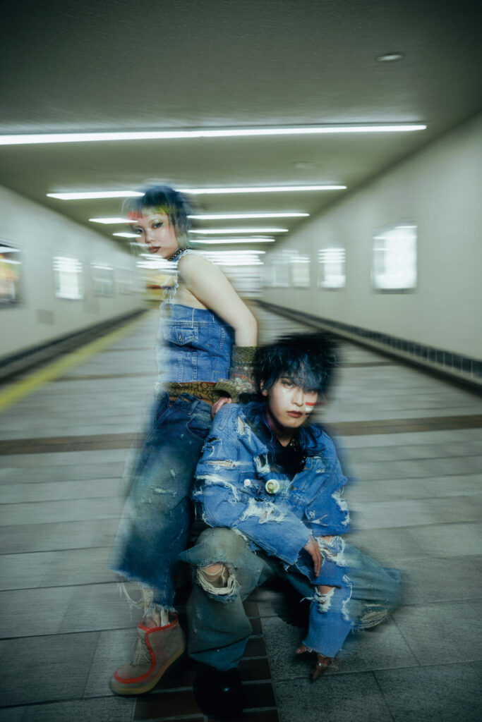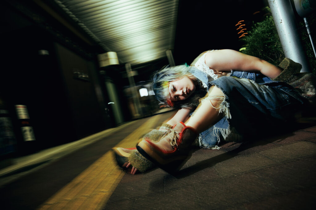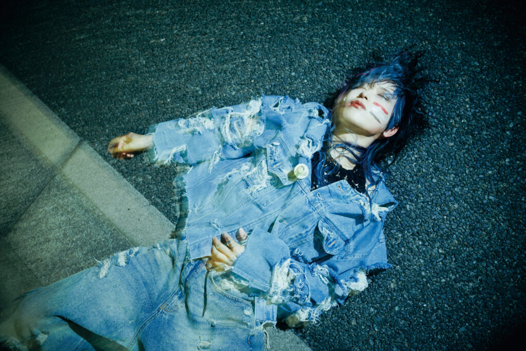 特集シューティングでYuki氏(baho IZM)が掲げたコンセプトの核は、「カウンターカルチャーと〈光〉」。いまの日常や既成概念を過去に置き、未来へ目を向ける。個の〈自由〉を促し、自分を自由に表現することの楽しさを体感させるように作品が構築された。流行に追随するのではなく、60年代の反骨的ムードを意識し、デニムのブルーを基調に衣装は自ら加工・リメイク。退廃的で反社会的な気配を纏わせ、アンチSNSとしてお尻には「秘すれば花」の文字が。ロケーションは、Yuki氏自身も身を置く倉敷の街。夜の街の光が、〈グランジ〉の世界観を街に浮かび上がらせた。