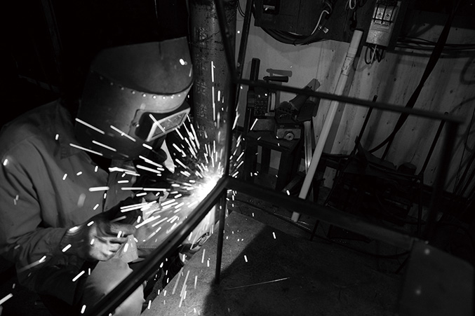 津山の工房で溶接を行う様子。1978年に創業した当時は産業部品を中心に製作しており、その技術基盤が現在の家具づくりへと応用されている。トライアンドエラーを繰り返しながら新たな表現を探求している。