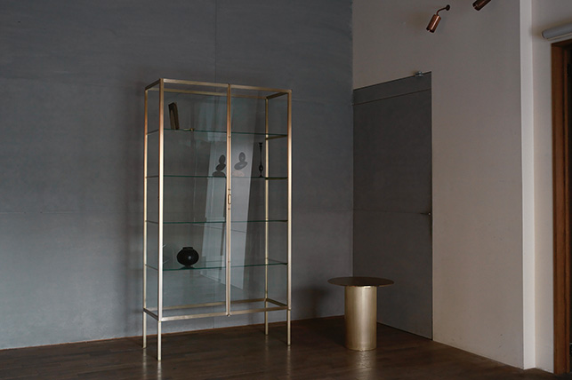 真鍮キャビネットは特に接合方法など工夫を凝らした代表作。木材に通ずる質感と経年によって変化する表情が特徴で、住宅や店舗の空間に品のある独特の存在感が生まれる。